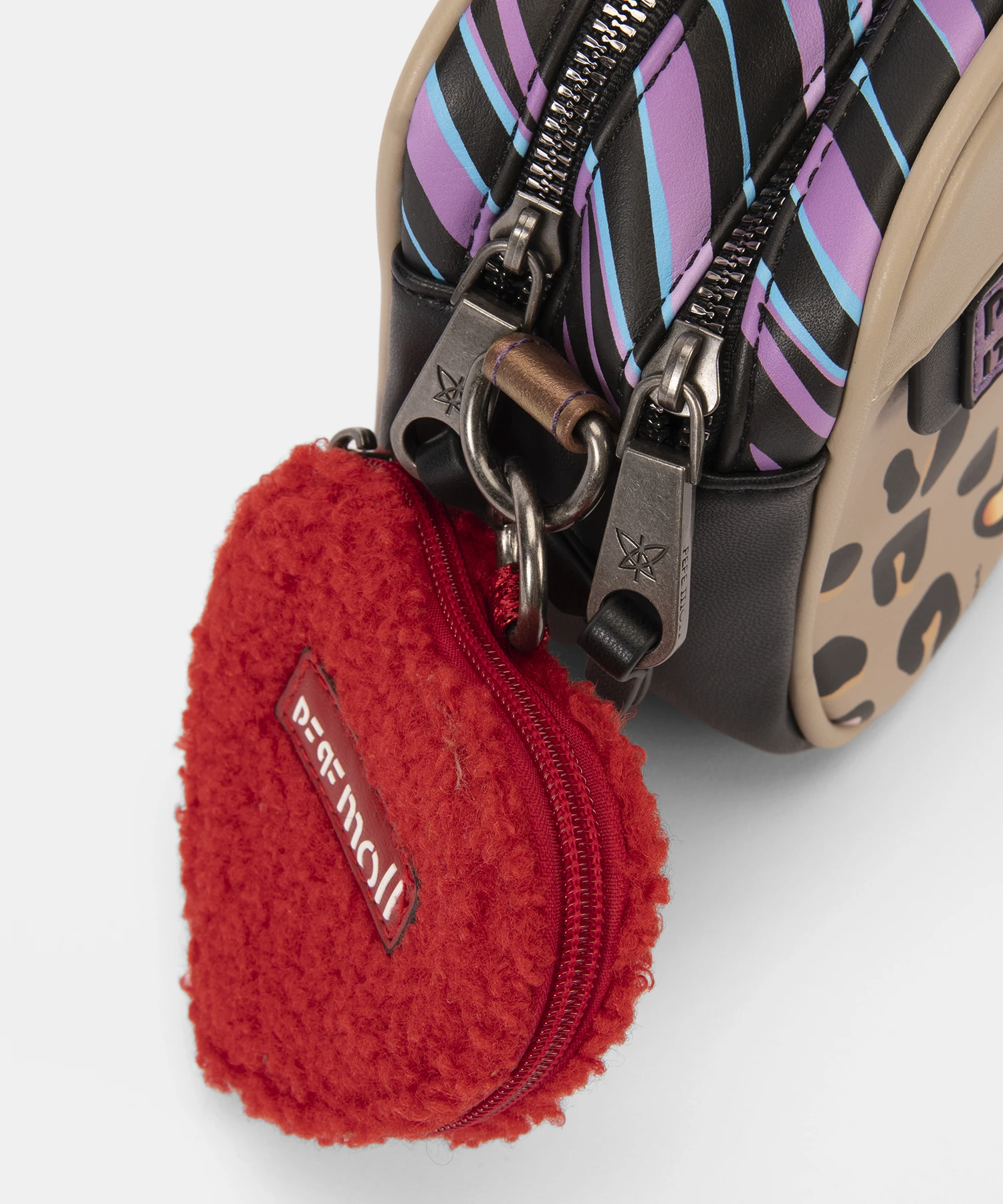 De formato rectangular estructurado, está confeccionado con materiales veganos de alta calidad. Como detalle distintivo, incorpora un charm de peluche en forma de corazón rojo, que además funciona como pequeño monedero con cremallera. En uno de los laterales, destaca un bolsillo exterior con cremallera y un ilustrado corazón estampado que suma personalidad al conjunto.