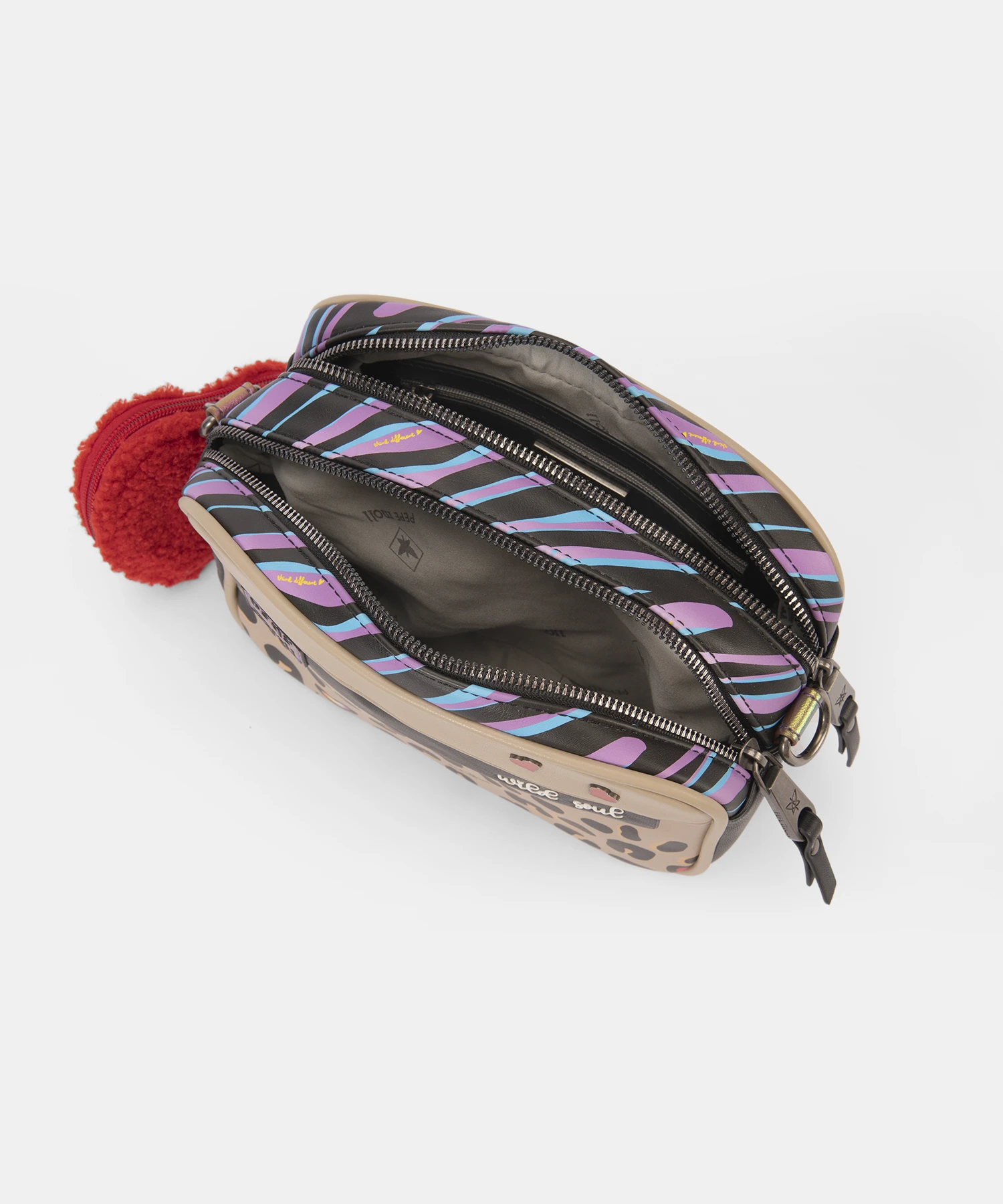 El interior está forrado con tela gris claro con estampado sutil del logo PEPE MOLL y se divide en dos compartimentos principales con cierre de cremallera metálica, ideal para mantener tus esenciales bien organizados. Además, incluye un bolsillo interior con cremallera para objetos más pequeños.
