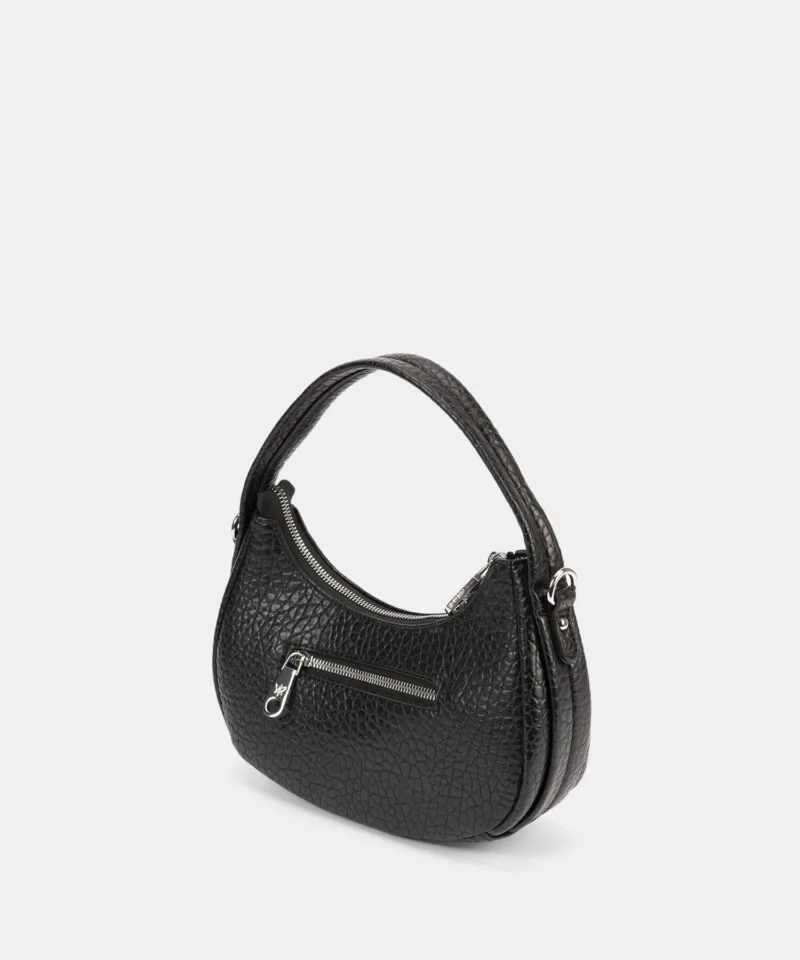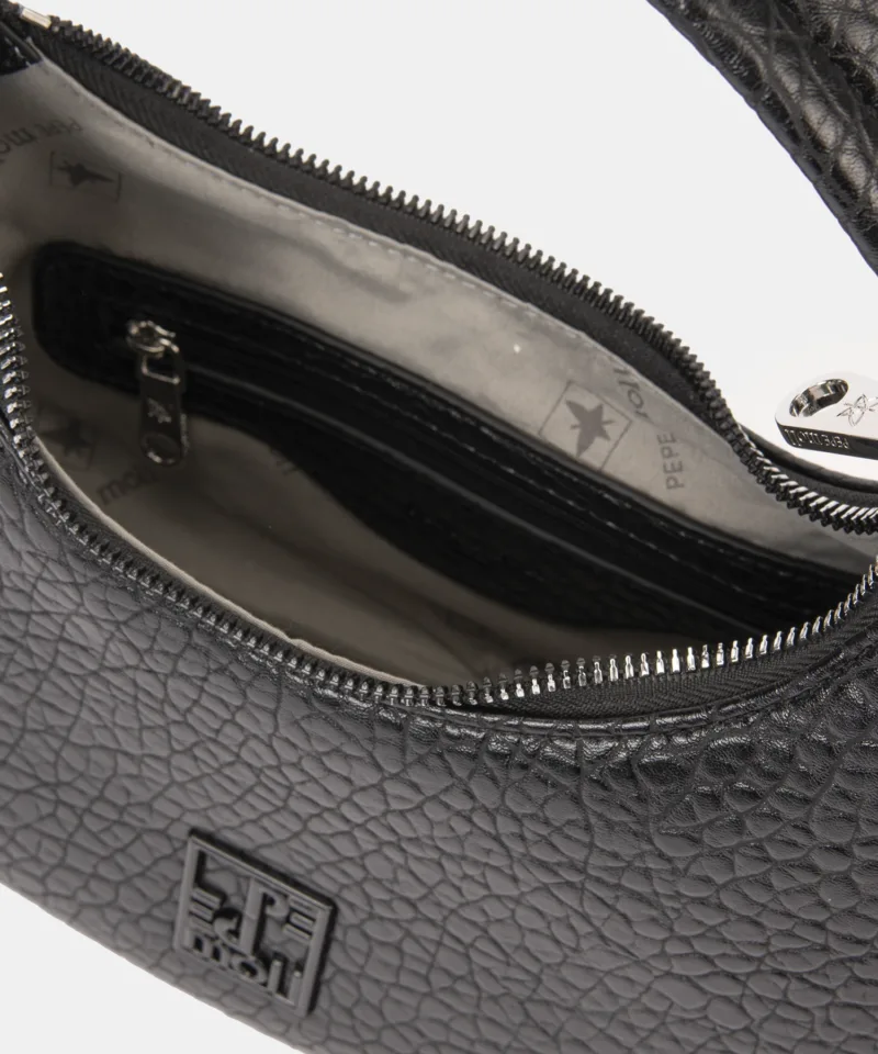 l bolso de mano 252293 de Pepe Moll combina diseño clásico y detalles actuales en un formato compacto y muy práctico. Su forma de media luna aporta dinamismo al conjunto, mientras que su textura exterior lo convierte en una pieza sofisticada y fácil de combinar.