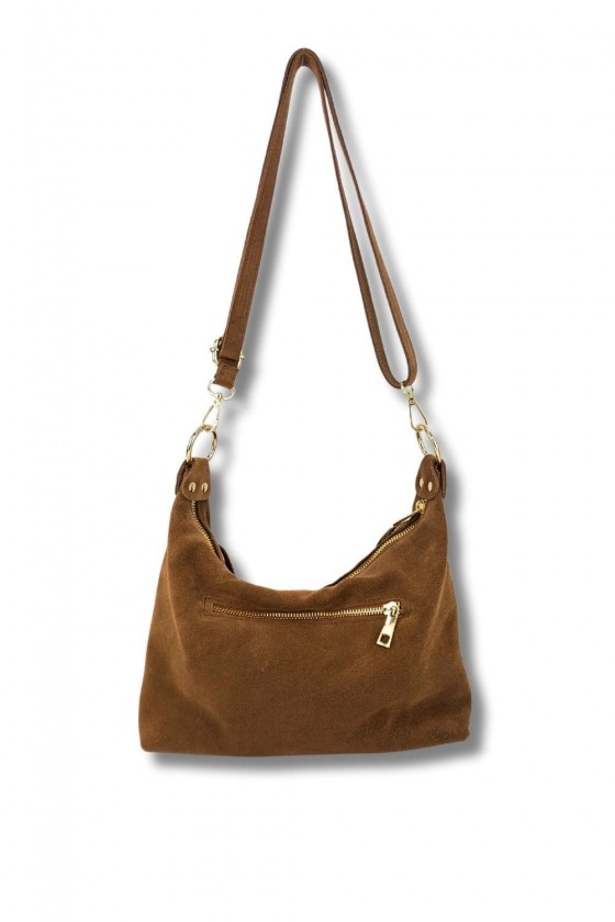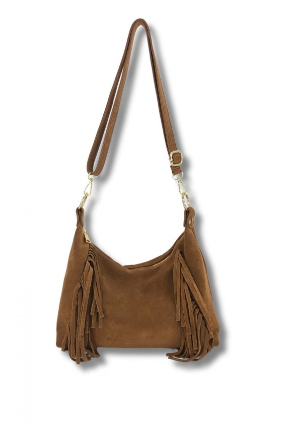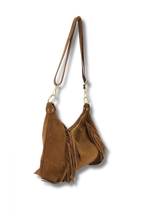 Bolso góndola serraje acabado con flecos. Cerrado con cremallera, asa bandolera ajustable. Forro interior con bolsillo cerrado con cremallera.